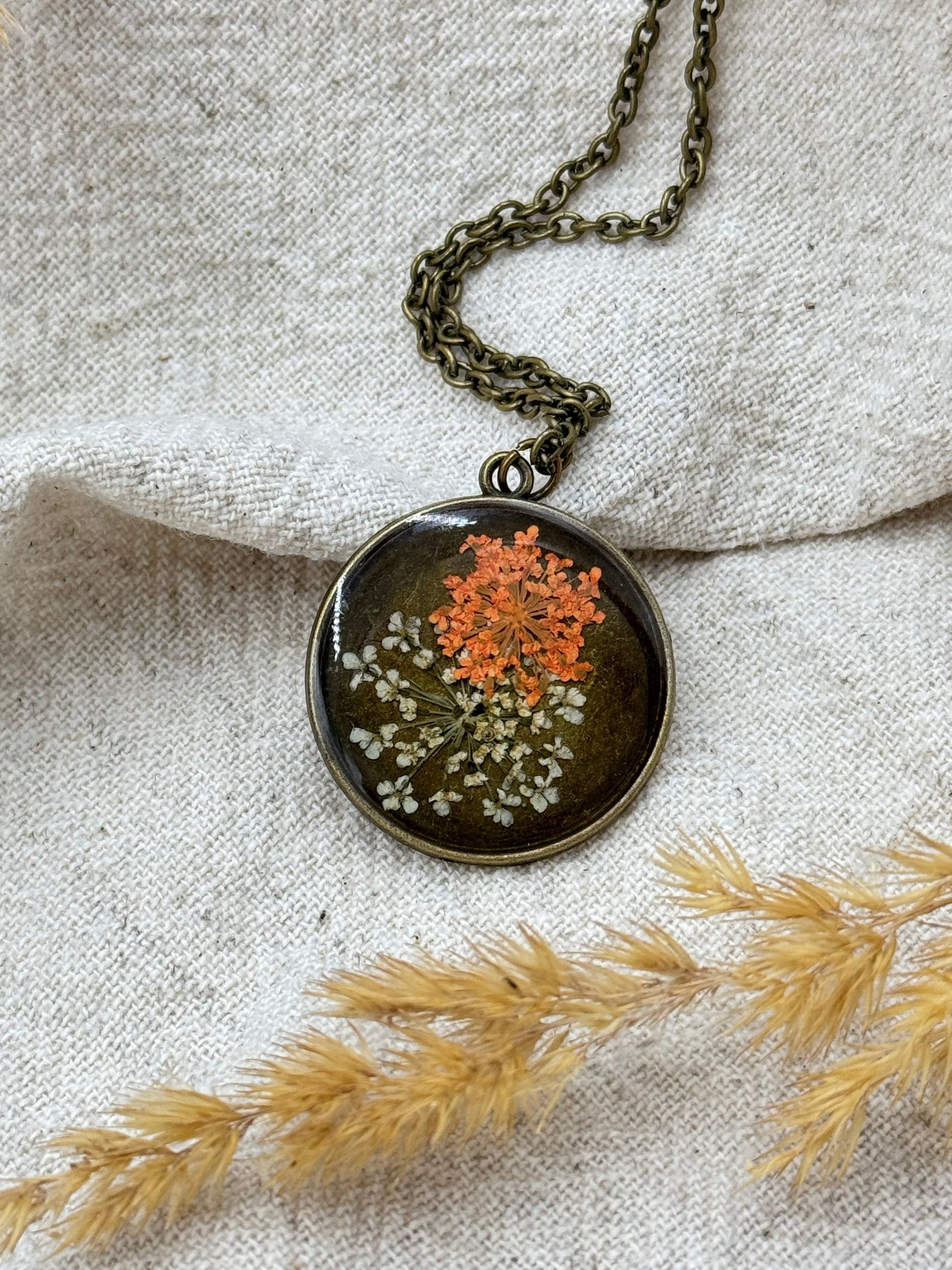Der harmonische Zusammenspiel von zarten Blüten und dem glänzenden, durchsichtigen Harz macht die Kette zu einem besonderen Blickfang – ideal für den Alltag oder als liebevolles Accessoire zu besonderen Anlässen.