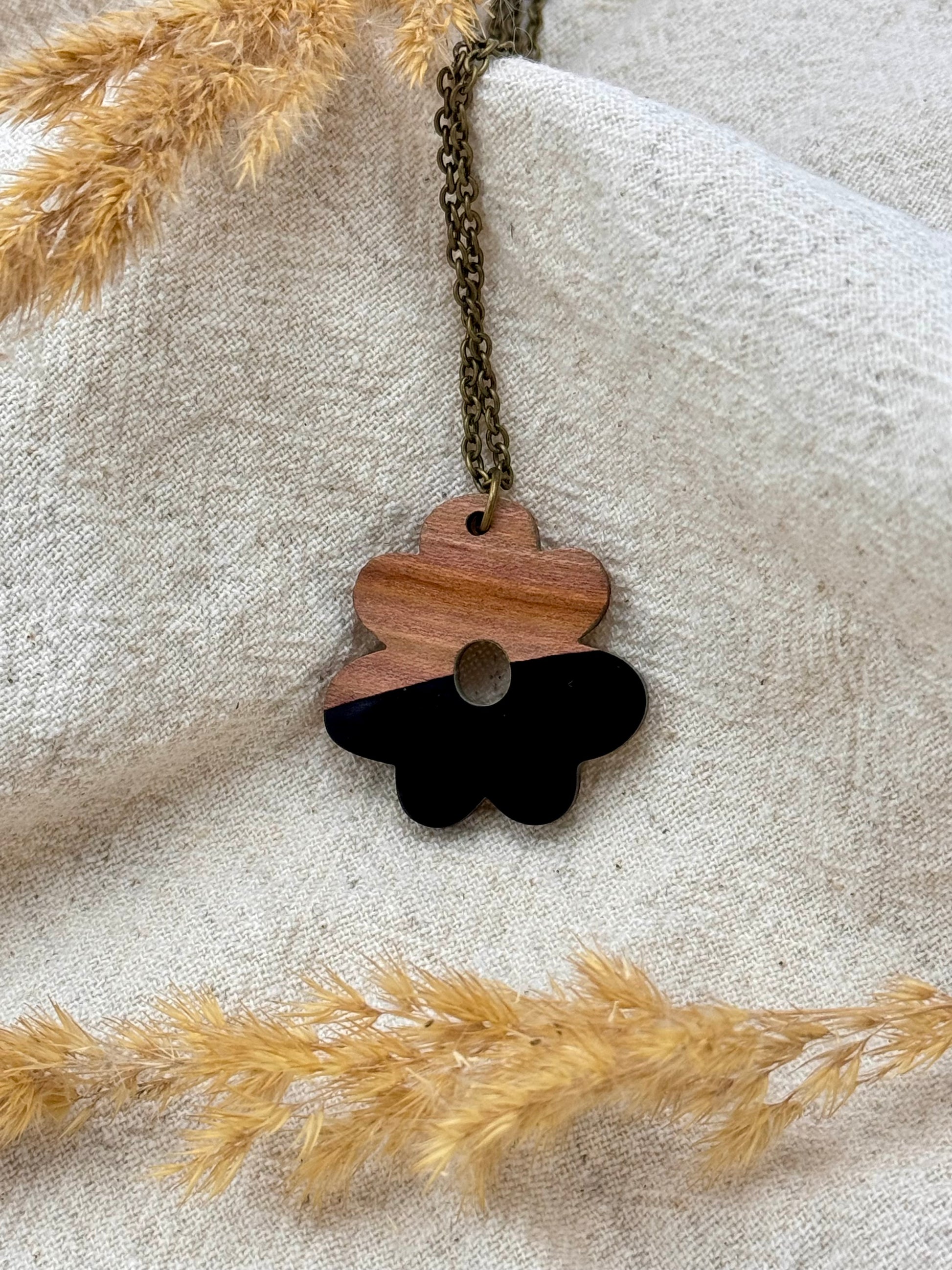 Der harmonische Kontrast zwischen warmem Holz und glänzendem Harz macht die Kette zu einem Blickfang – ob im Alltag oder als besonderes Accessoire bei besonderen Anlässen.