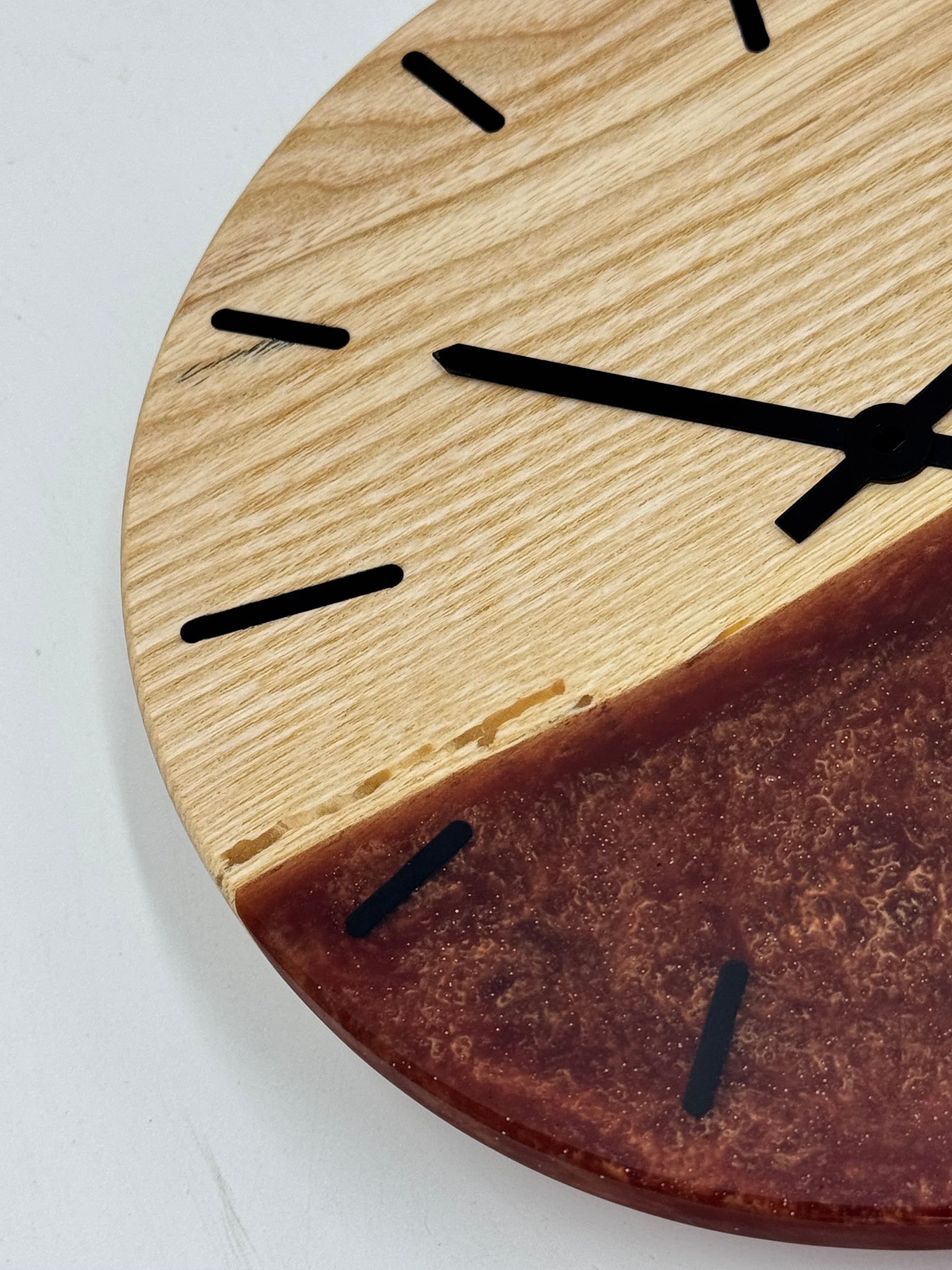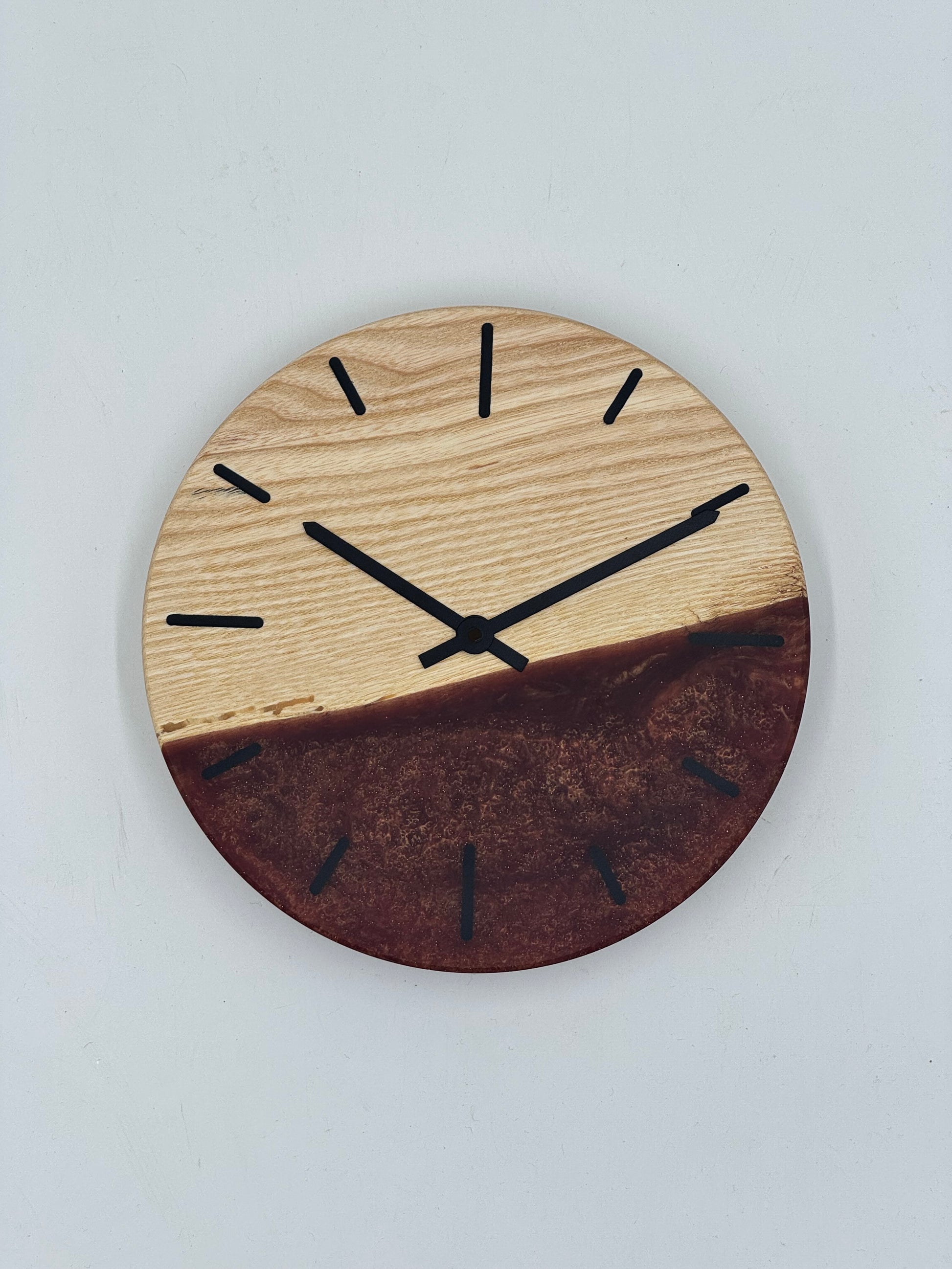 Die Uhr beeindruckt mit ausgewähltem Holz und farbigem Epoxidharz, präzise verarbeitet in einem ansprechenden Durchmesser passend für Deine vier Wände.
