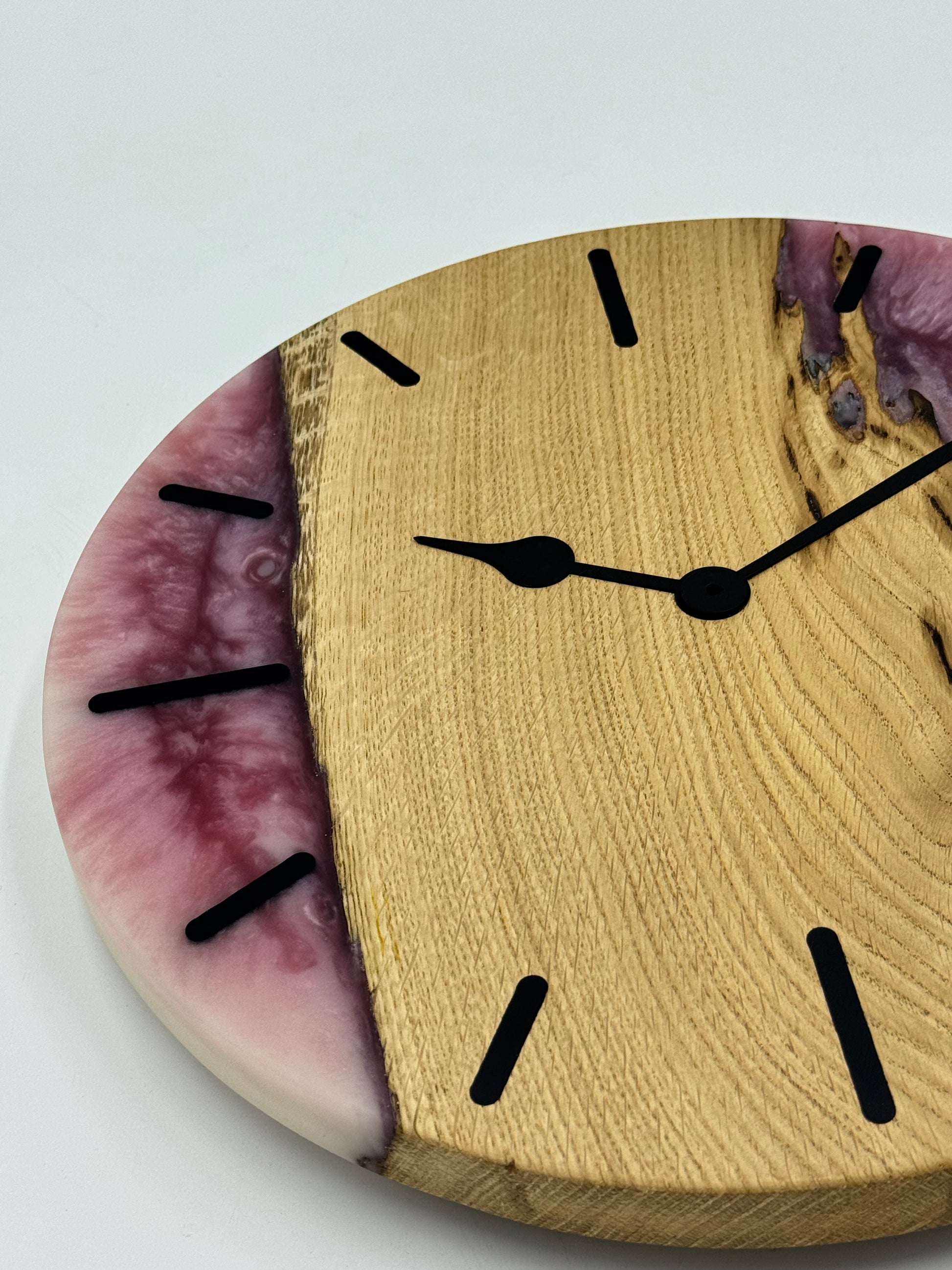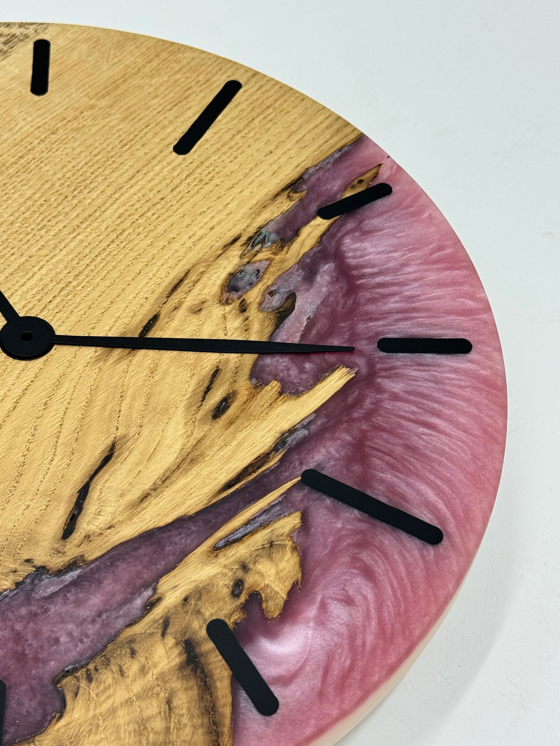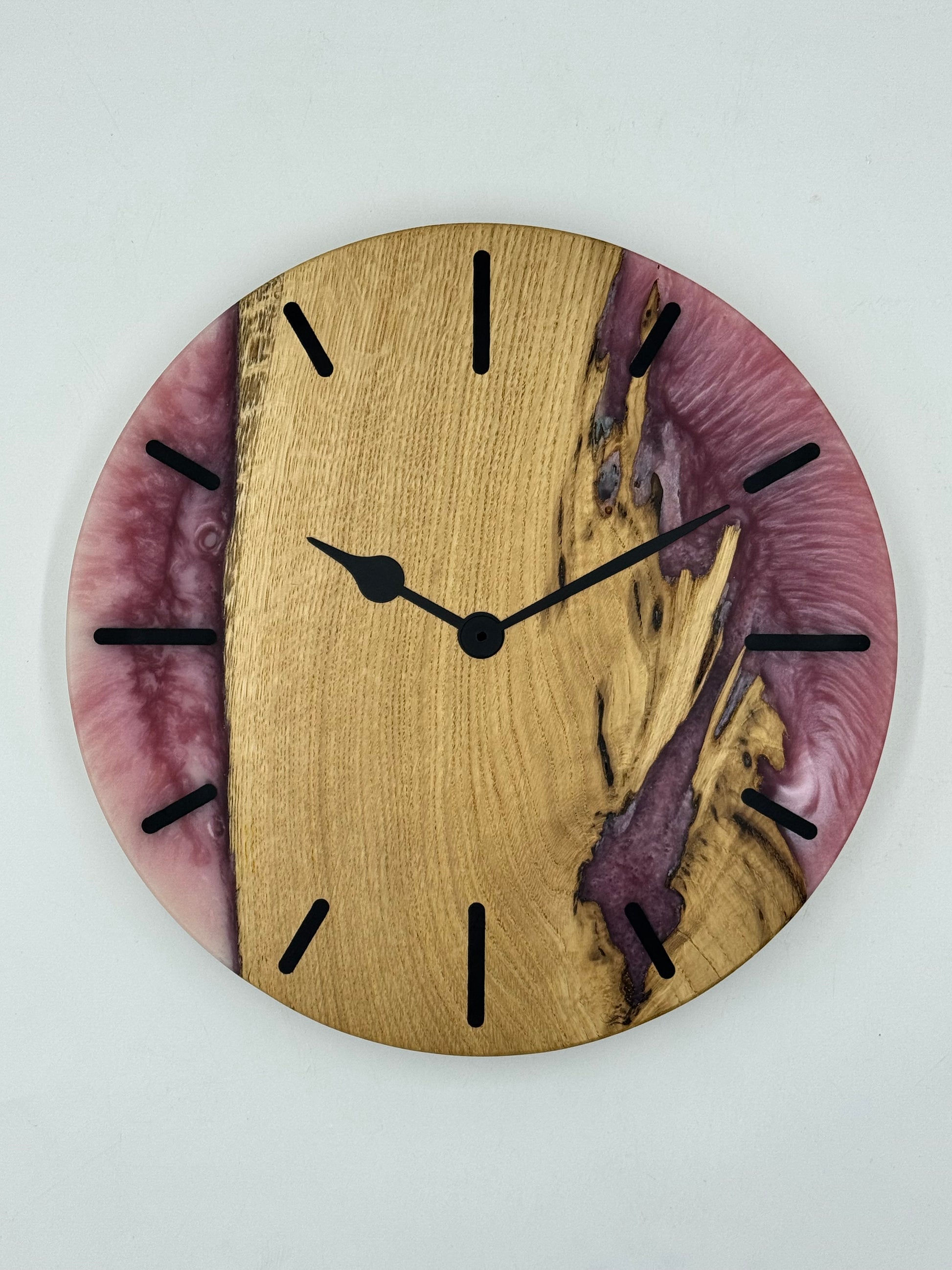 Die Uhr beeindruckt mit ausgewähltem Holz und farbigem Epoxidharz, präzise verarbeitet in einem ansprechenden Durchmesser passend für Deine vier Wände.