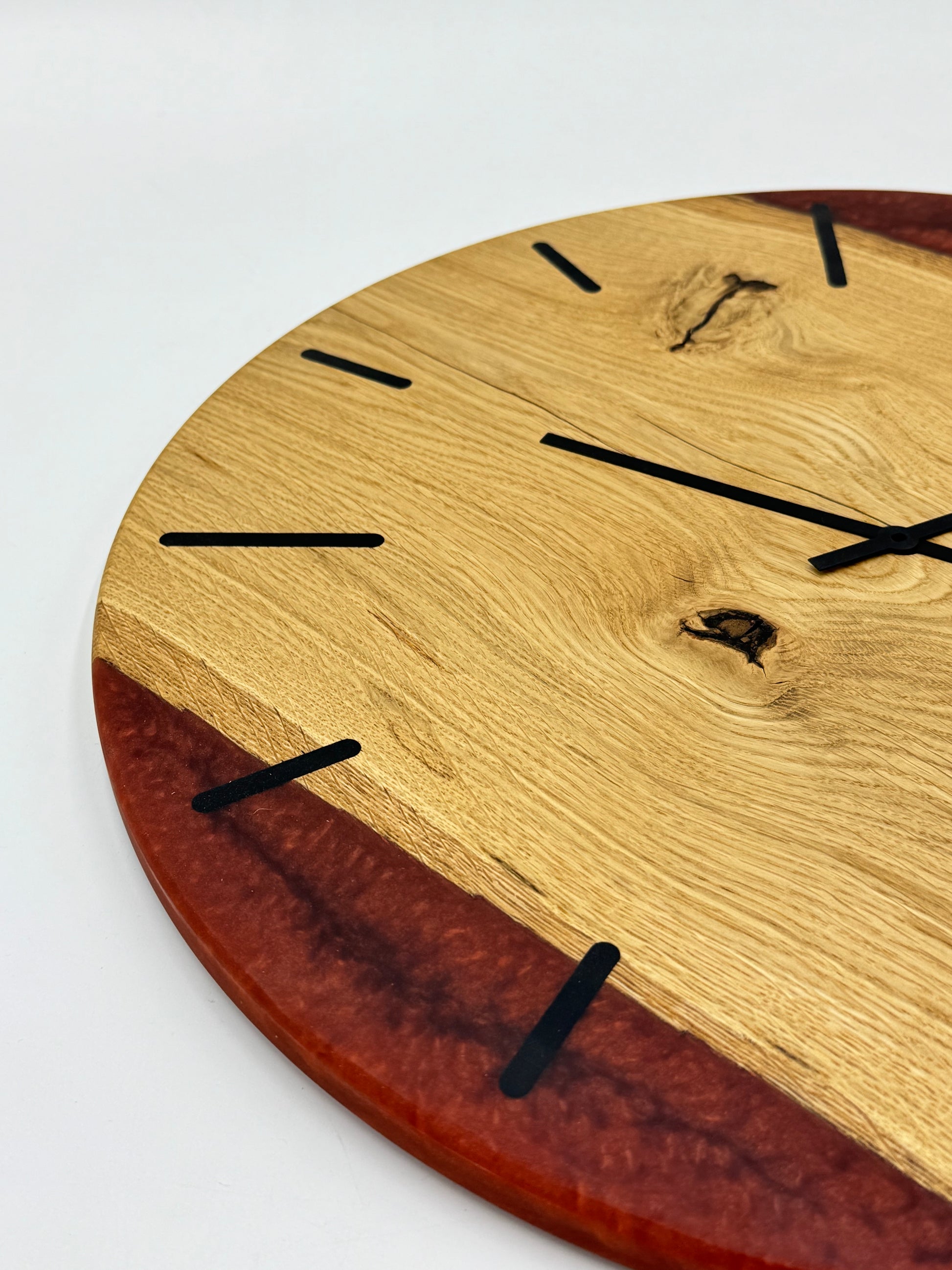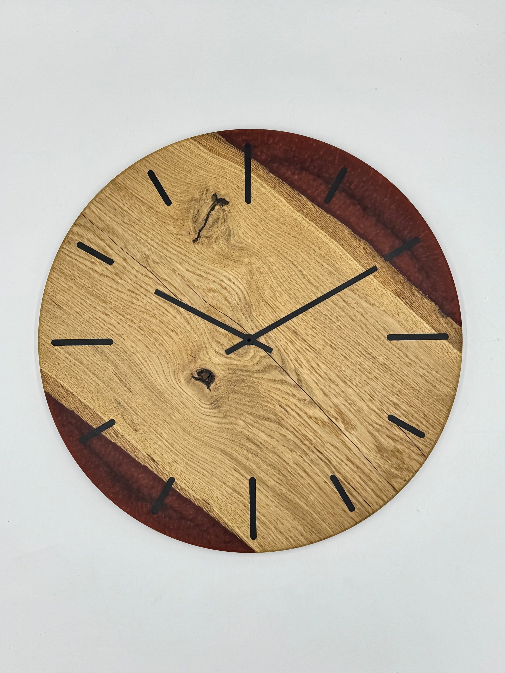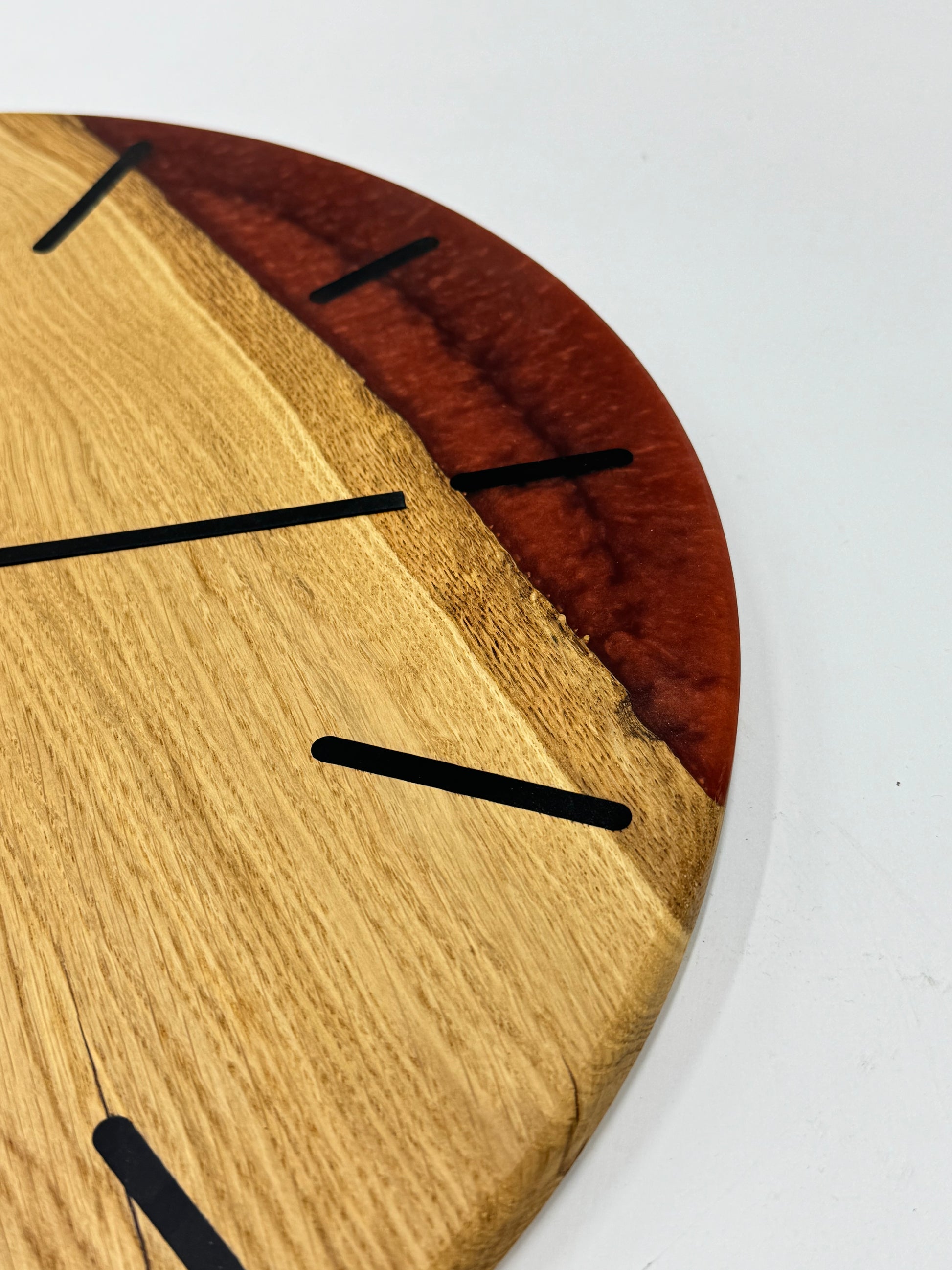 Die Uhr beeindruckt mit ausgewähltem Holz und farbigem Epoxidharz, präzise verarbeitet in einem ansprechenden Durchmesser passend für Deine vier Wände.