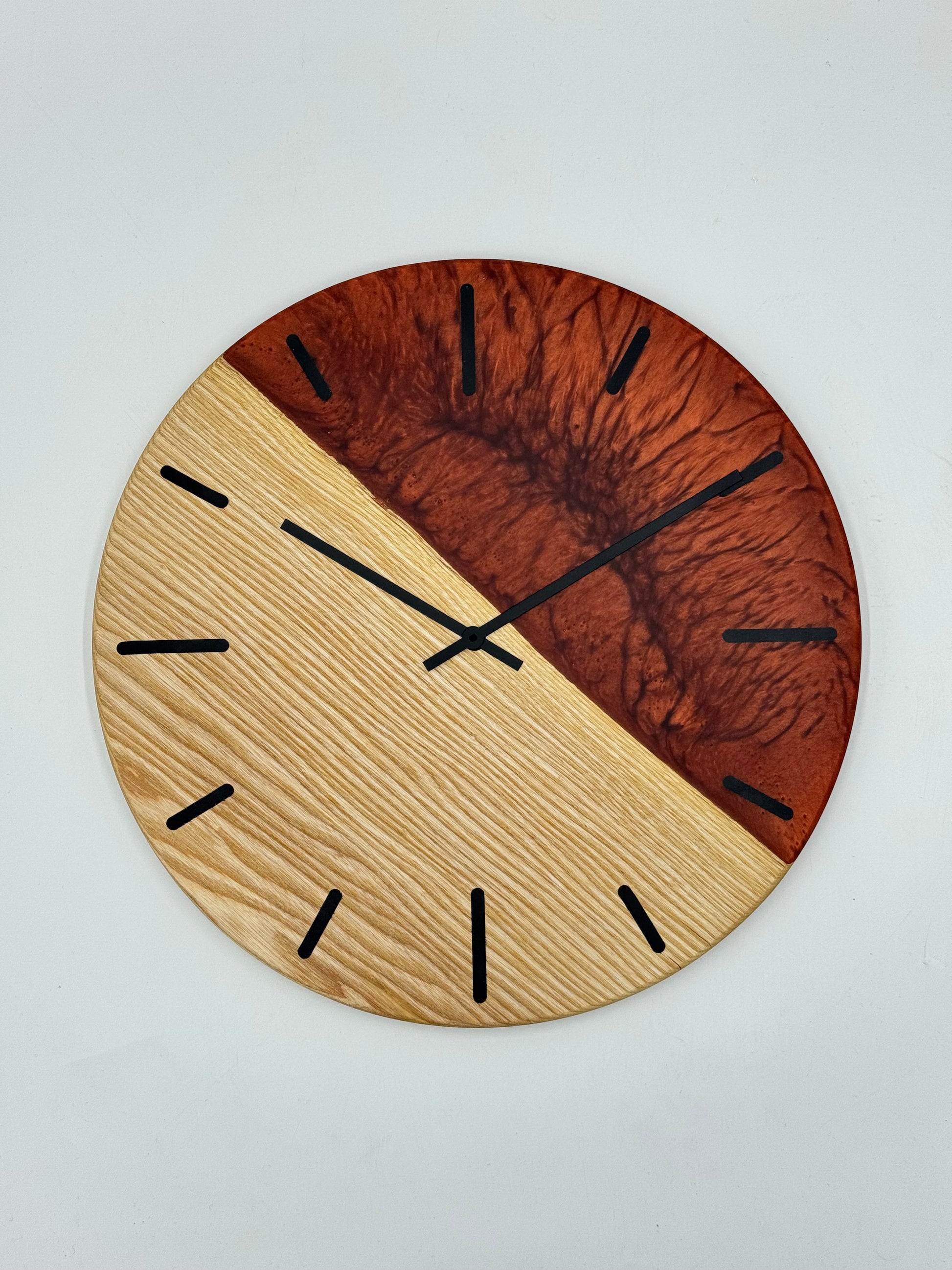 Die Uhr beeindruckt mit ausgewähltem Holz und farbigem Epoxidharz, präzise verarbeitet in einem ansprechenden Durchmesser passend für Deine vier Wände.