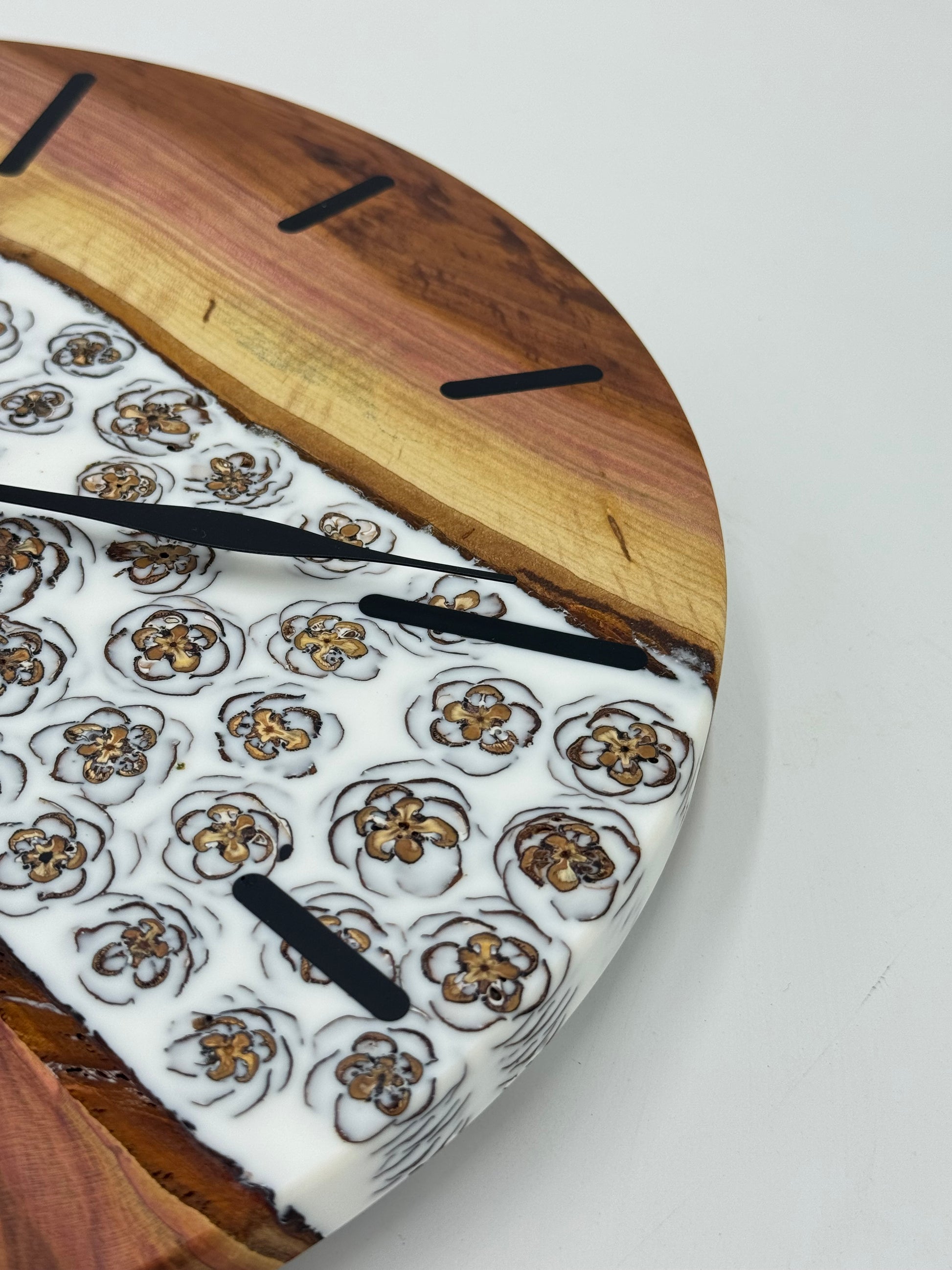 Die Uhr beeindruckt mit ausgewähltem Holz und farbigem Epoxidharz, präzise verarbeitet in einem ansprechenden Durchmesser passend für Deine vier Wände.